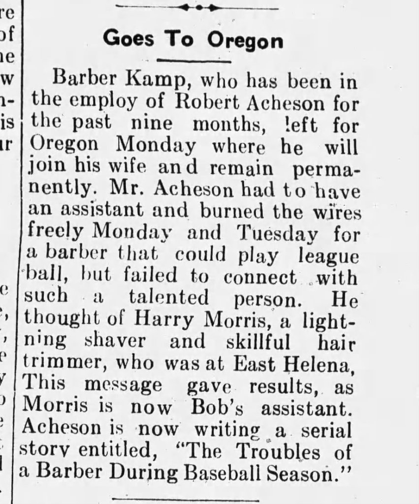 Missouri Harry had advertisements in the local paper for his barber shop. He was called Harry “Blackie” Morris. The mention of a son and a daughter from a previous marriage in the obituary does give me pause. Potentially this Missouri Harry is the same as the Wyoming Harry and Viola. Perhaps Harry and Viola had two children and separated. I could be spinning myself in circles. Ed Morrison, the brother mentioned in the obit, was not born in Scotland, but Warren County, Pennsylvania. Ed married Hattie Hulet and his father was Alanson James Morrison. This Morrison family had deep roots in Northwestern Pennsylvania and Southwestern New York. The data here, again is so juicy, but I cannot connect the dots. For the time being, it is intriguing, but just a thread of many that I continue to pull at, hoping for the big reveal.